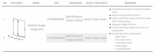 View full detailsFeature 10mm toughened shower screen glass Available sizes:850*1500 (fix panel 500, door 350)1000*1500 (fix panel 500, door 500) Available colou...